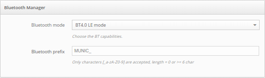 allows you customize the BT prefix name (we append at its end the SerialNumber of the device). Default value "MUNIC_". |